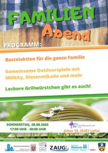 Familienabend Kalender Wann: 28. August 2025 um 17:00 – 20:00 2025-08-28T17:00:00+02:00 2025-08-28T20:00:00+02:00 Wo: Familienzentrum Lollar Schur 18 35457 Lollar