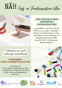 Nähtreff für Frauen Kalender Wann: 1. September 2025 um 16:00 – 19:00 2025-09-01T16:00:00+02:00 2025-09-01T19:00:00+02:00 Wo: Familienzentrum Lollar Schur 18 35457 Lollar Kontakt: Carolin Müller 064193228663 E-Mail
